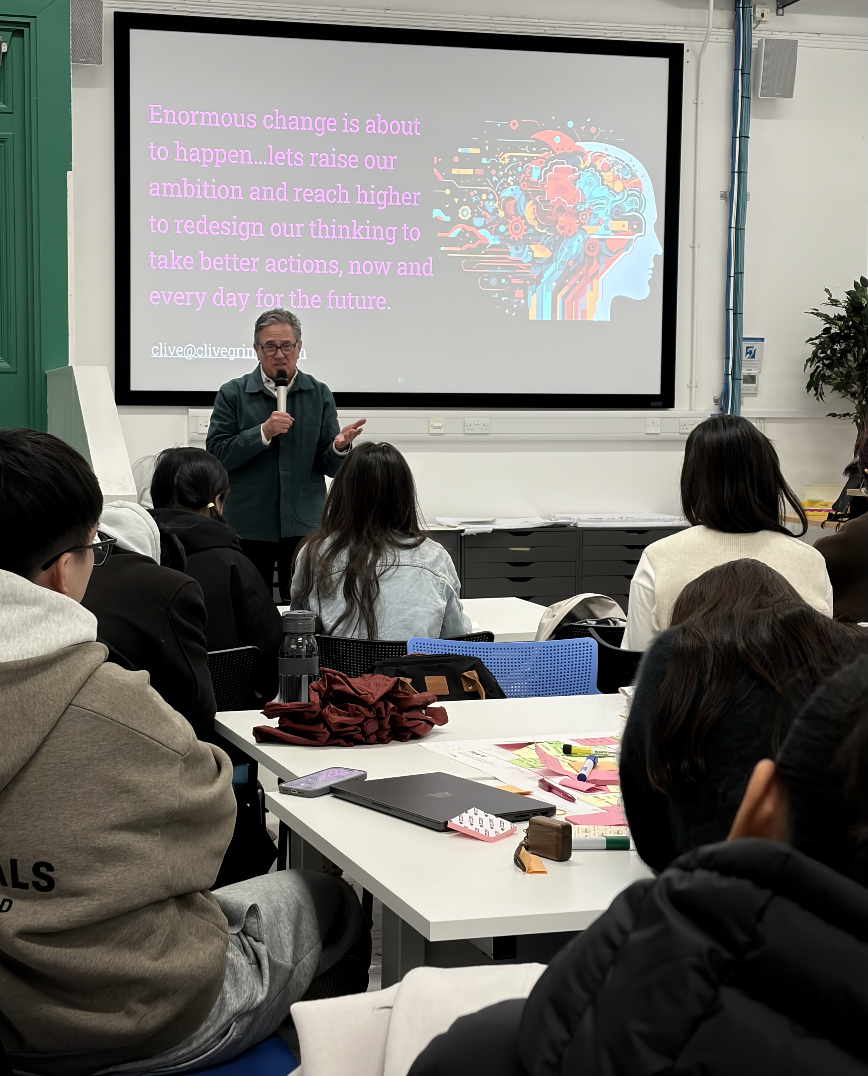 This week in SIT, students on our MDes Design Innovation programmes were joined in the Glasgow Studio by Professor Clive Grinyer for a highly informative and engaging talk about the past, present and future of design. Clive is a highly influential British designer with a career spanning more than thirty years, primarily focused on human-centred design, service design, and design thinking.